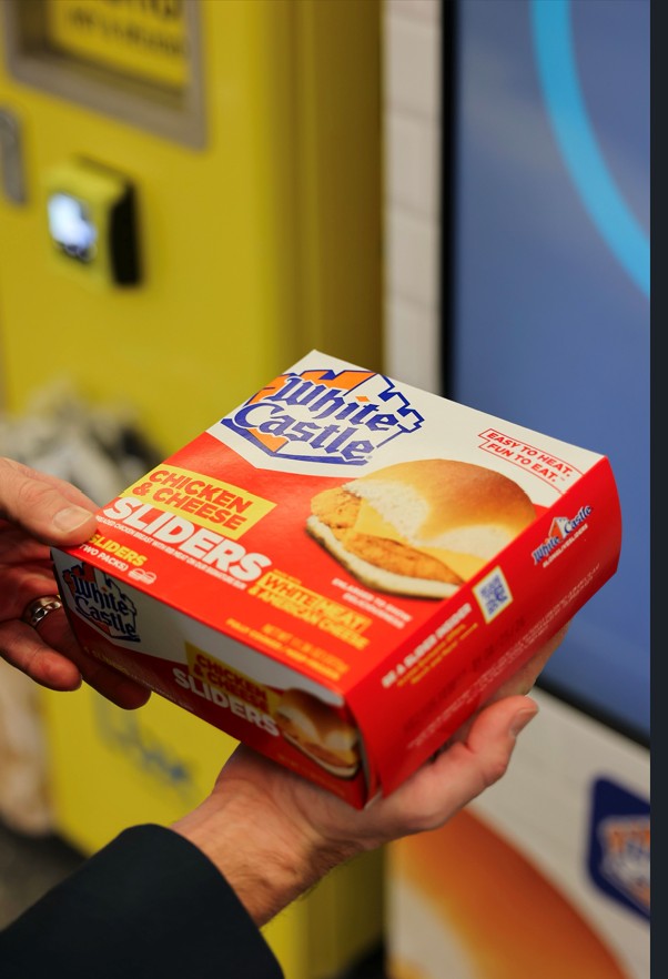 One machine serves up boxes of hot sliders from fast-food chain White Castle, including beef sliders, cheese sliders and cheddar bacon cheese sliders. Available 24/7, the machine promotes that the service has “No Tips, No Fees, No Lines.”