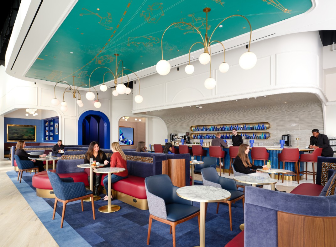 This one, called ‘BlueHouse,” is in JetBlue’s flagship Terminal 5 at New York’s John F. Kennedy International Airport (JFK). The 9,000-square-foot, two-level lounge is designed with a NYC apartment-style aesthetic, Art Deco design, lots of art and some surprises.