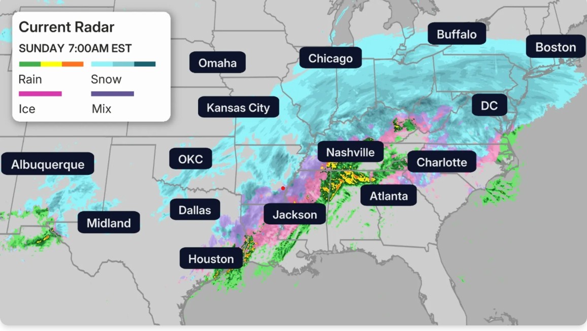 The Weather Channel map, above, snapped at 7 am East Coast time on Sunday morning, shows which parts of the country are experiencing snow, rain, ice or a mix of it all.
