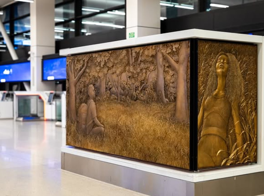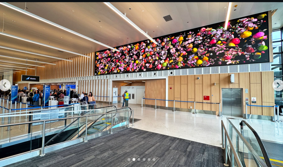 At the very north end of the terminal ticketing lobby, Jennifer Steinkamp’s ‘Cosmic’ is a 60-foot-long digital art work with moving apples, apple blossoms and flowers.