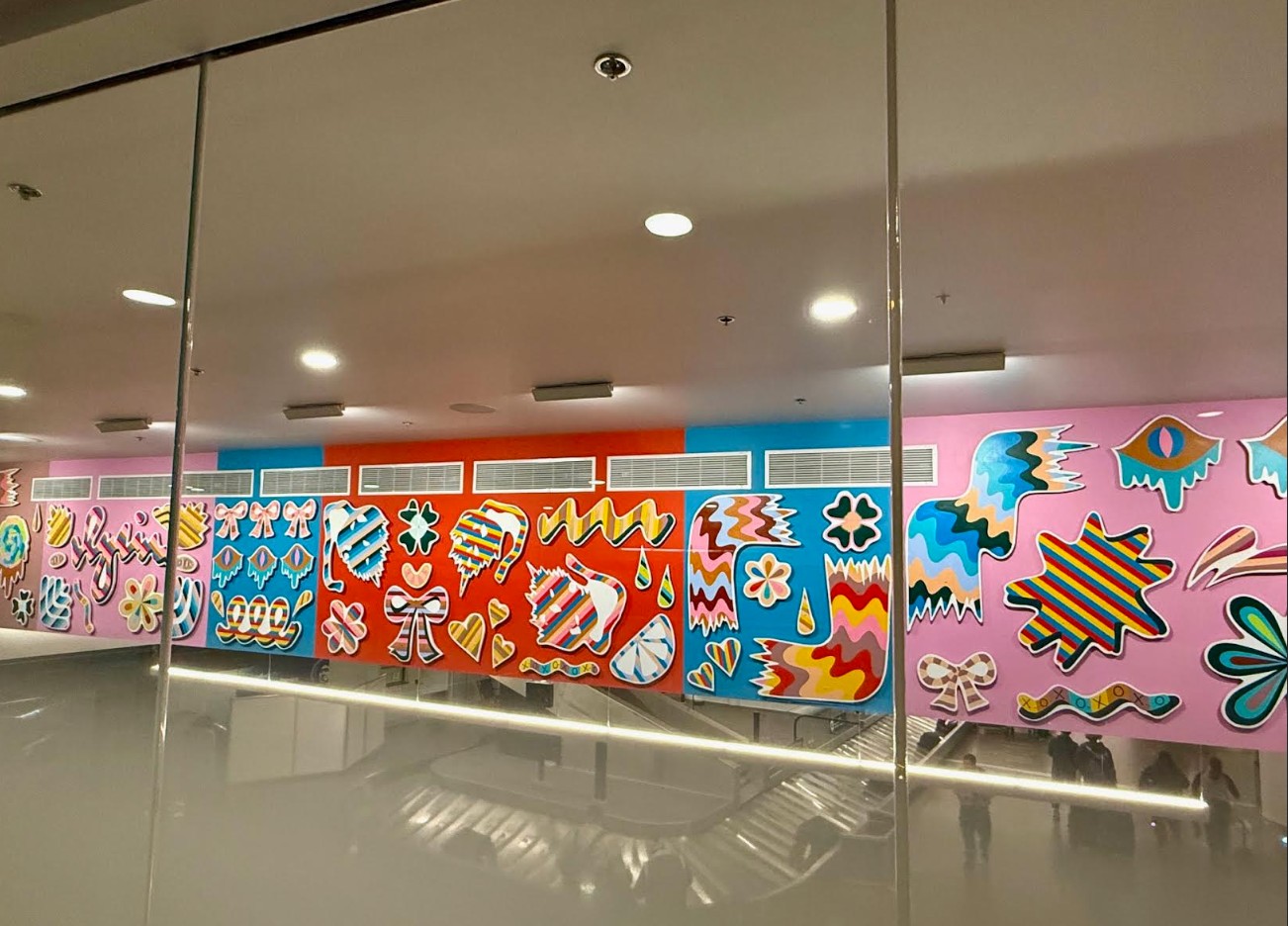 And on the bag claim level, it will be hard to miss Julie Alpert’s bright and cheery pop-up walls.