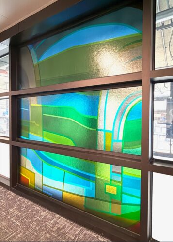 Along the new check-in stations for Alaska Airlines on the bridge level, look for Morgan Madison’s 13 glass wall panels.