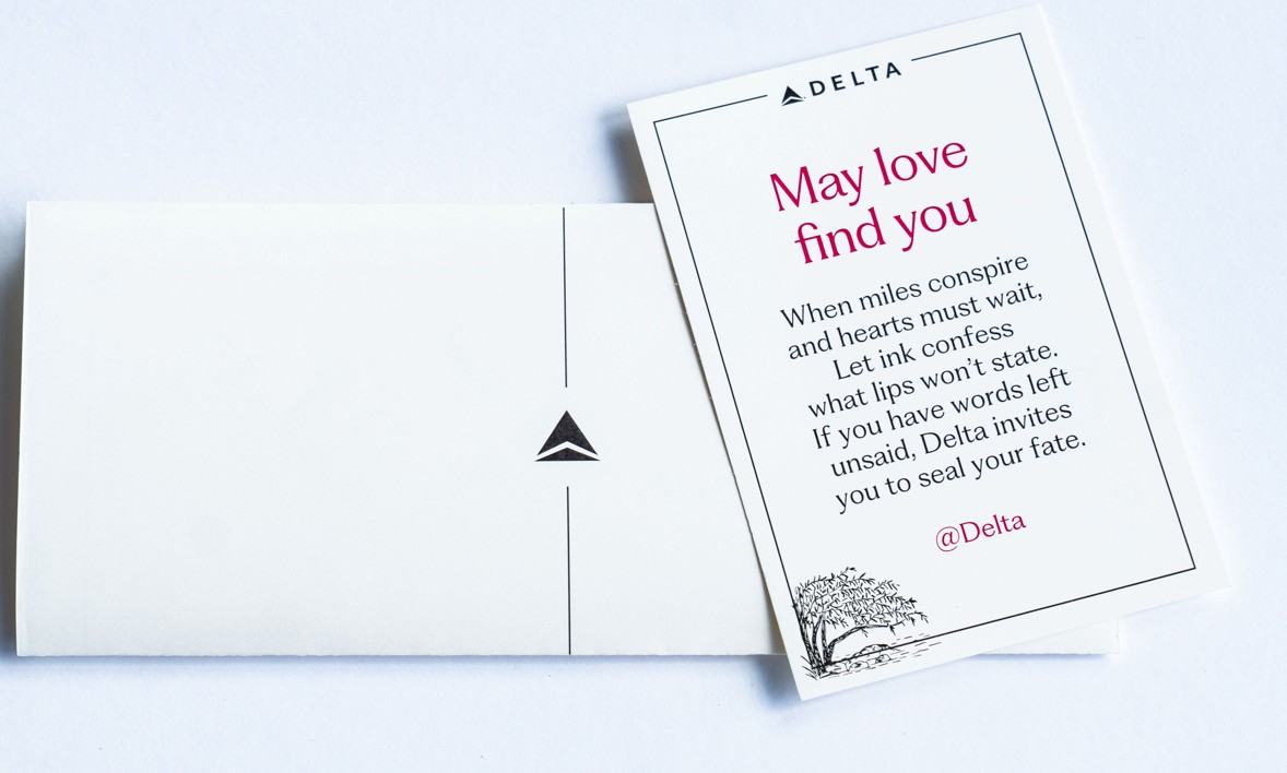 On all Delta flights from Hartfield-Jackson Atlanta International Airport (ATL) to London Heathrow Airport (LHR) on Friday, Feburary 13, Delta will be handing out packets containing ‘romanticized’ stationary and a pre-stamped international envelope.