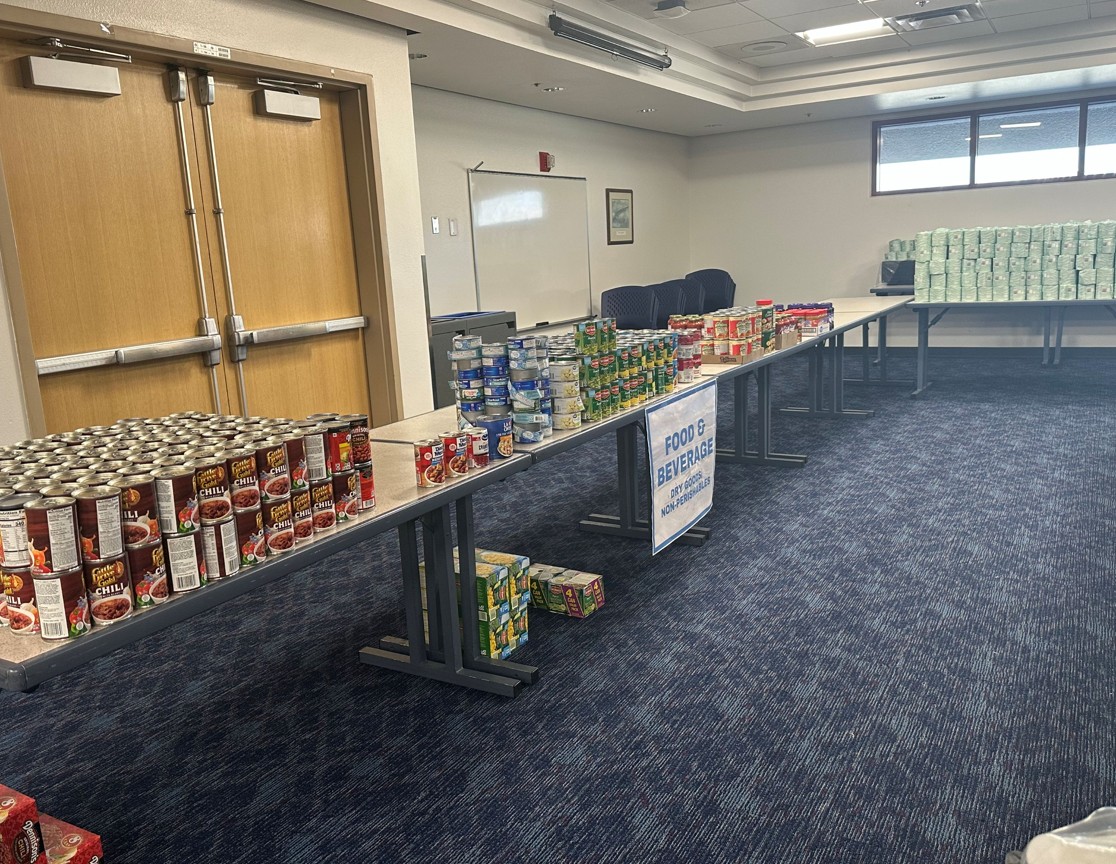 Donations of high-need items including nonperishable food items, toiletries and hygiene products, baby supplies, household essentials, and pet supplies are being collected at the Airport Control Center.