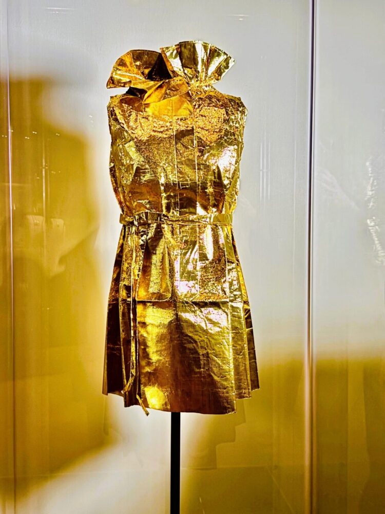 The shiny, eye-catching number below is a gold paper minidresss by designer Elisa Daggs. This was introduced in 1968 as part of a Trans World Airlines (TWA) “Foreign Accent” promotion.