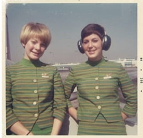 (Northwest Flight attendants posing in their ‘caterpillar’ uniforms)