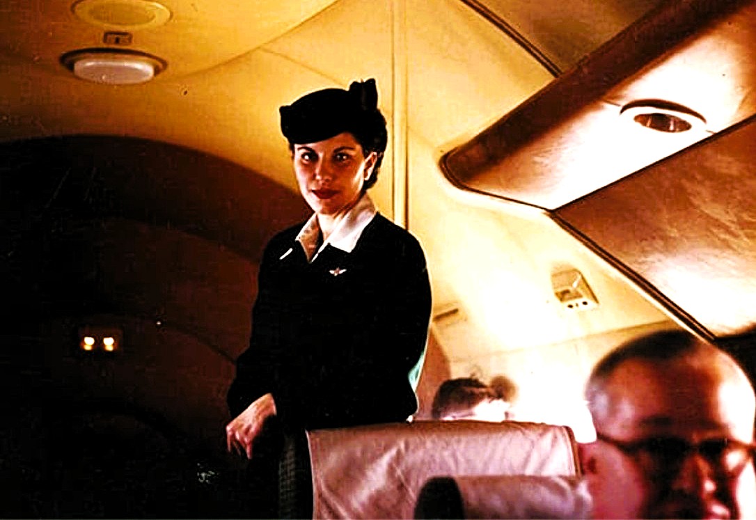 (Western Airlines flight attendant Lorraine Coccio Ditsworth aboard a flight in her winter uniform)