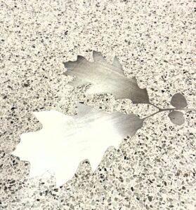 These aluminum leaves are actual size and associated with the tree columns that support the roof.