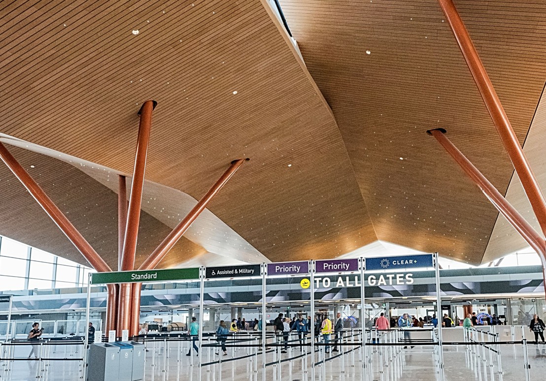 Passengers now enter the terminal via a light-filled main hall with 38 steel, tree-shaped columns supporting a soaring, undulating wood ceiling dotted with 4,000 constellation lights.