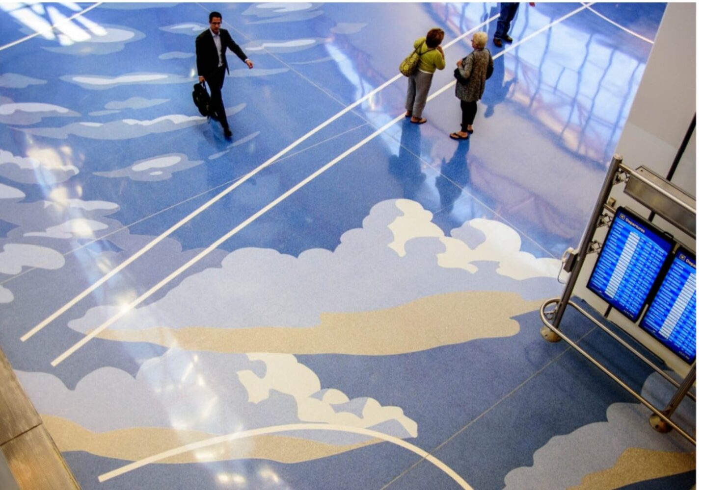 The 13,000 square feet of new terrazo flooring is an extension of “The Sky Beneath our Feet,” the 82,000 square-foot terrazzosky floor that Merrell created for the airside terminal back in 2013.