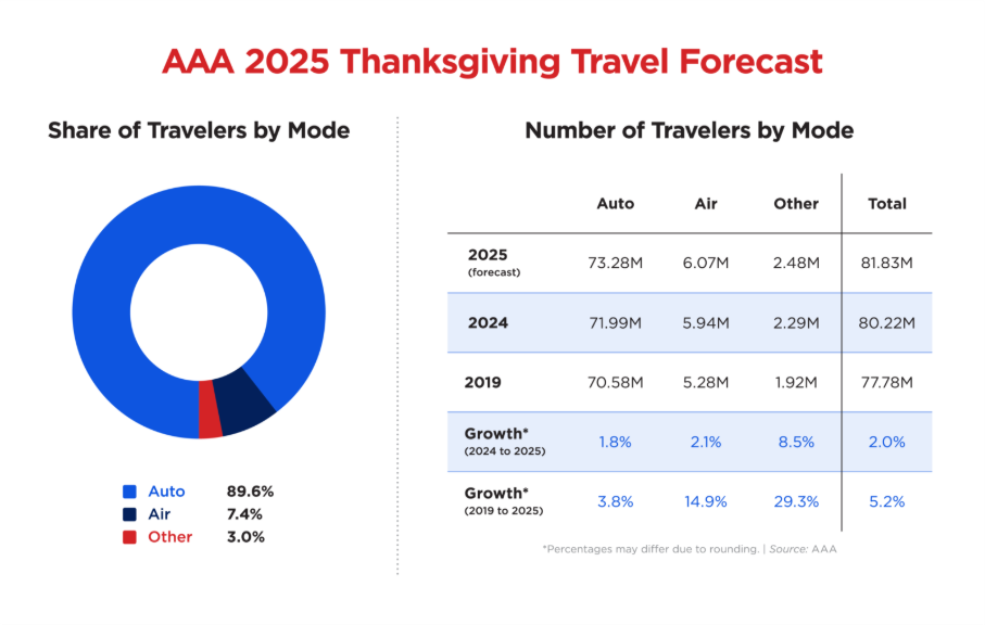 AAA predicts that 81.8 million people will travel at least 50 miles from home over the Thanksgiving holiday period, which this year stretches from Tuesday, November 25 to Monday, December 1.