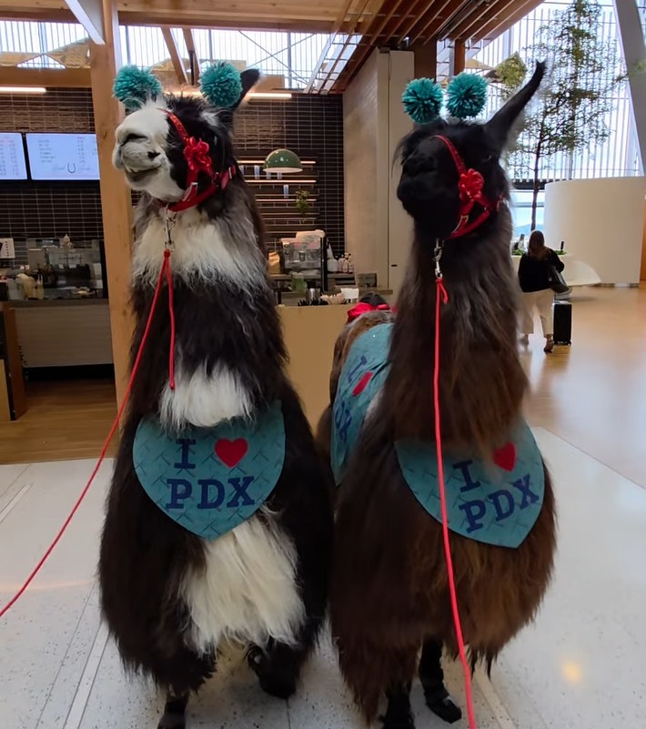 Those charming therapy llamas, Panda and Beni, will be pretending to be reindeers at Portland International Airport (PDX) this holidy season with visits starting Tuesday 24 and repeating every week until Christmas with visits scheduled on December 3rd, 11th, 18th and 23rd.