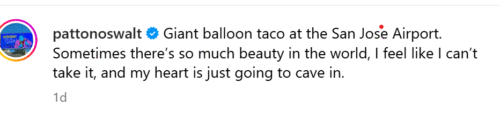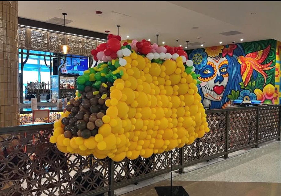 A giant taco made from balloons is a wonderful object to encounter anywhere. Let alone an airport. Thank you, San Jose Mineta International Airport (SJC) for ‘hosting’ the taco and comedian/actor Patton Oswalt for adoring it.