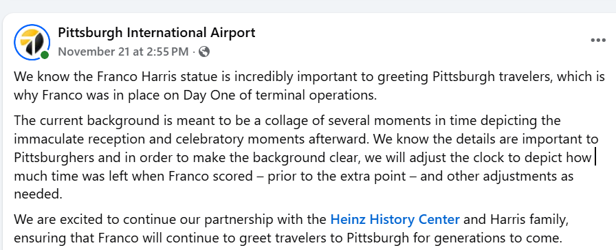 PIT Airport’s Immaculate Reception statue – relocated & fixed